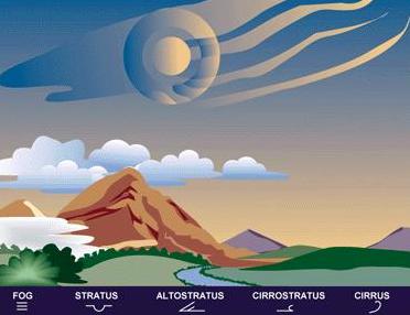 The word “alto” (meaning “high”) is generally added to designate clouds at intermediate heights, usually appearing at levels of 5,000 to 20,000 feet—as “altostratus” or “altocumulus.” Clouds formed in the upper levels of the troposphere (commonly between 20,000 and 50,000 feet) are composed of ice crystals and generally have a delicate, curly appearance, somewhat similar to frost on a windowpane. For these clouds, the word “cirro” (meaning “curly”) is added—as “cirrocumulus” or “cirrostratus.” At these high altitudes, there is also a fibrous type of cloud appearing as curly wisps, bearing the single name “cirrus.” |