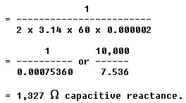In figure 8-191, a series circuit is illustrated in which a capacitor of 200 mf is connected in series with a 10 ohm lamp. What is the value of the impedance, the current flow, and the voltage drop across the lamp? |