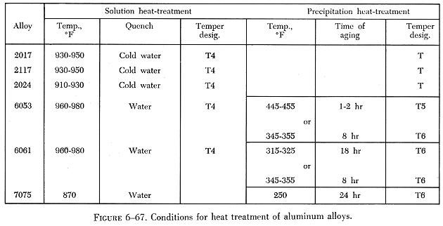 The temperatures used for precipitation hardening depend upon the alloy and the properties desired, ranging from 250° F to 375° F. They should be controlled within a very narrow range (plus or minus 5°) to obtain best results. (See figure 6-67.)