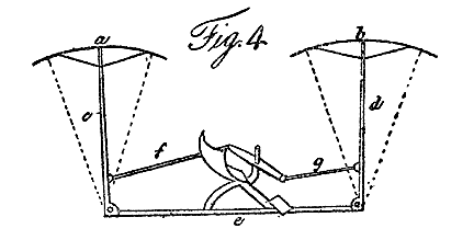 P. S. In lieu of applying the continued action of the inclined plane by means of the rotative motion of flyers, the same principle may be made use of by the alternate motion of surfaces backward and forward; and although the scanty description hitherto published of Mr. Degen's apparatus will scarcely justify any conclusion upon the subject; yet as the principle above described must be the basis of every engine for aerial navigation by mechanical means, I conceive, that the method adopted by him has been nearly as follows. Let A and B, fig. 4, be two surfaces or parachutes, supported upon the long shafts C and D, which are fixed to the ends of the connecting beam E, by hinges. At E, let there be a convenient seat for the aeronaut, and before him a cross bar turning upon a pivot in its centre, which being connected with the shafts of the parachutes by the rods F and G, will enable him to work them alternately backward and forward, as represented by the dotted lines. If the upright shafts be elastic, or have a hinge to give way a little near their tops, the weight and resistance of the parachutes will incline them so, as to make a small angle with the direction of their motion, and hence the machine rises. A slight heeling of the parachutes toward one side, or an alteration in the position of the weight, may enable the aeronaut to steer such an apparatus tolerably well; but many better constructions may be formed, for combining the requisites of speed, convenience and steerage. It is a great point gained, when the first experiments demonstrate the practicability of an art; and Mr. Degen, by whatever means he has effected this purpose, deserves much credit for his ingenuity.