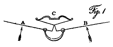 With regard to the second obstacle in the way of aerial navigation, viz. the length of leverage to which large winglike surfaces are exposed, it may be observed, that, being a constant and invariable quality, arising from the degree of support such surfaces give, estimated at their centres of resistance, it may be balanced by any elastic agent, that is so placed as to oppose it. Let A and B, Pl. IV, fig. 1, be two wings of an aerial vehicle in the act of skimming; then half the weight of the vessel is supported from the centre of resistance of each wing; as represented by the arrows under them. If the shorter ends of these levers be connected by cords to the string of a bow C, of sufficient power to balance the weight of the machine at the points A and B, then the moving power will be left at full liberty to produce the waft necessary to bend up the hinder edge of the wing, and gain the propelling power. A bow is not in fact an equable spring, but may be made so by using a spiral fusee. I have made use of it in this place merely as the most simple mode of stating the principle I wished to exhibit. Should a counterbalancing spring of this kind be adopted in the practice of aerial navigation, a small well polished cylinder, furnished with what may be termed a bag piston (upon the principle made use of by nature in preventing the return of the blood to the heart, when it has been driven into the aorta, by the intervention of the semilunar valves) would, by a vacuum being excited each stroke of the wing, produce the desired effect, with scarcely any loss by friction.1 These elastic agents may likewise be useful in gradually stopping the momentum of large surfaces when used in any alternate motion, and in thus restoring it during their return.