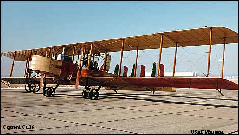 In late 1914 Italian aeronautical engineer Gianni Caproni developed a three-engine bomber, the Ca.31 powered by three Gnome rotary engines. The following year Caproni produced a new version - the Ca.32. It was very similar to the Ca.31 but with three FIAT 100 horsepower water-cooled in-line engines. Three months after Italy's entry into WWI, the first Ca.32's attacked an Austrian airbase at Aisovizza and by the end of the year regular raids were being mounted against other Austrian targets. Caproni continued to refine his successful design with the introduction of the Isotta-Fraschini powered Ca.33. The Isottas produced 150 horsepower and were generally more reliable than the FIATS. Toward the end of the war the definitive version, the Ca.36 went into production. Changes from the Ca.33 were small but included 5-section wings which made for easy disassembly and surface transportation. Ca.36 aircraft remained in Italian Air Force service as late as 1929. The Ca.36 on display was obtained by the USAF Museum in 1987. It was restored at the Museum and is on loan from the Museo Aeronautica Caproni di Taliedo in Italy. |